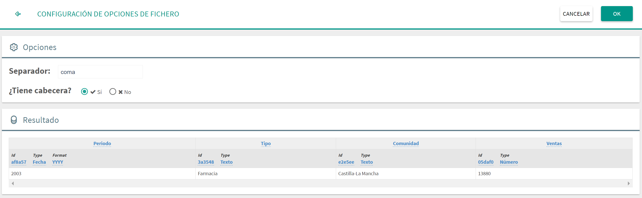 3. Resultado: En esta parte se ve la primera fila que se subirá al dataset a modo de ejemplo. A partir de ella se puede visualizar si la identificación autómatica es correcta, y además se permite cambiar los nombres de las columnas, los tipos de datos y los identificadores internos de Tabulae. Para realizar cualquiera de estas modificaciones solo hay que hacer clic encima de la propiedad que se quiere modificar, escribir el nuevo valor y pulsar Enter.