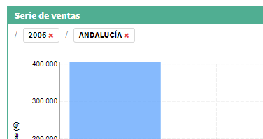 Cuando se hace clic en un valor el comportamiento consiste en filtrar por el valor seleccionado y representar la siguiente dimensión en la jerarquía. Los niveles drilldown seleccionados se ven en la parte superior del gráfico, lo que permite hacer rollup o recomposición del gráfico a los niveles precedentes haciendo clic en el icono .