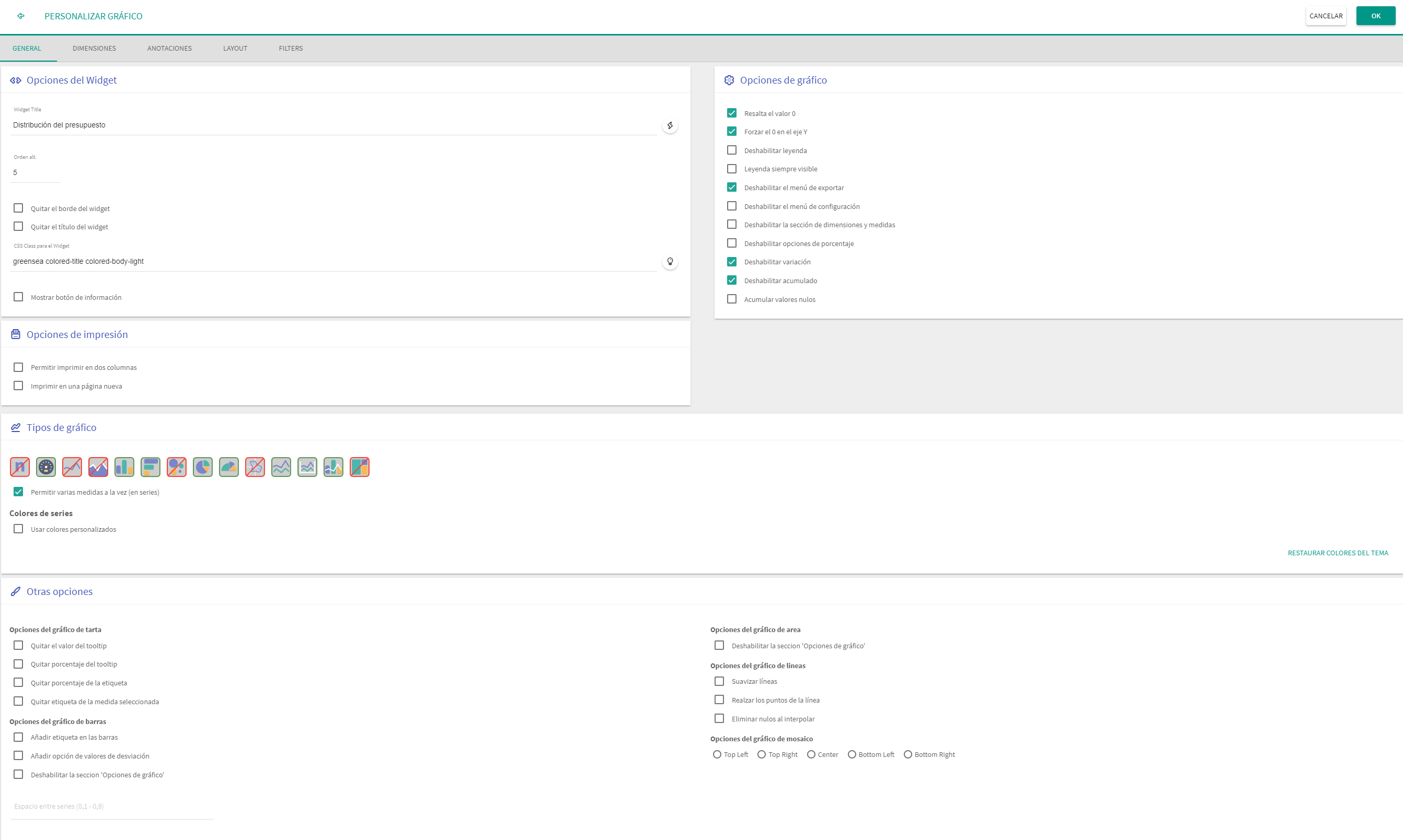- Tipos de gráfico: Permite la selección del tipo de gráfico deseado. De forma autómatica solo se muestran los tipos de gráfico compatibles con el conjunto de datos a mostrar (por ejemplo si hay dos dimensiones seleccionadas no es posible hacer un gráfico de tarta).